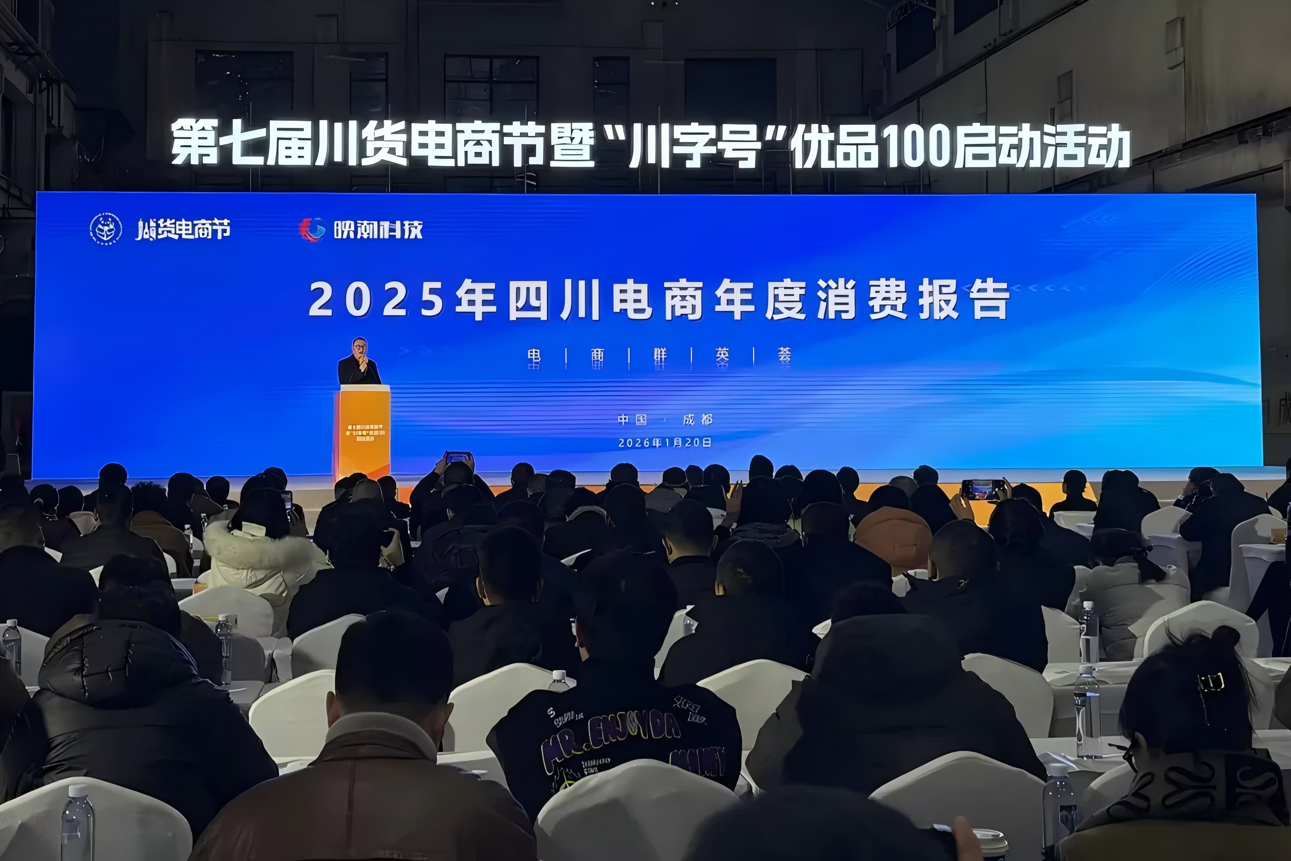 2026年1月20日,第七届川货电商节暨“川字号”优品100启动活动在成都隆重举行。四川省商务厅党组成员、副厅长陈友清出席活动并致辞。映潮科技受邀出席,并发布《2025年四川电商年度消费报告》。报告以全面、精准的数据揭示四川省电商2025年的整体情况,深度解读了过去一年四川电商经济的跨越式发展与结构性变化。